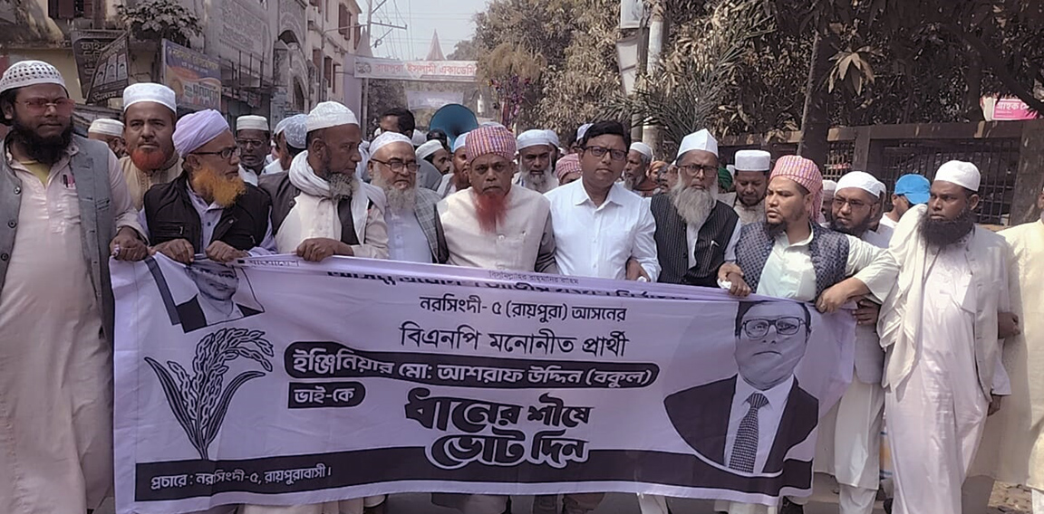 রায়পুরায় ধানের শীষের পক্ষে ওলামা দল, জমিয়ত ও হেফাজতের মিছিল ও পথসভা